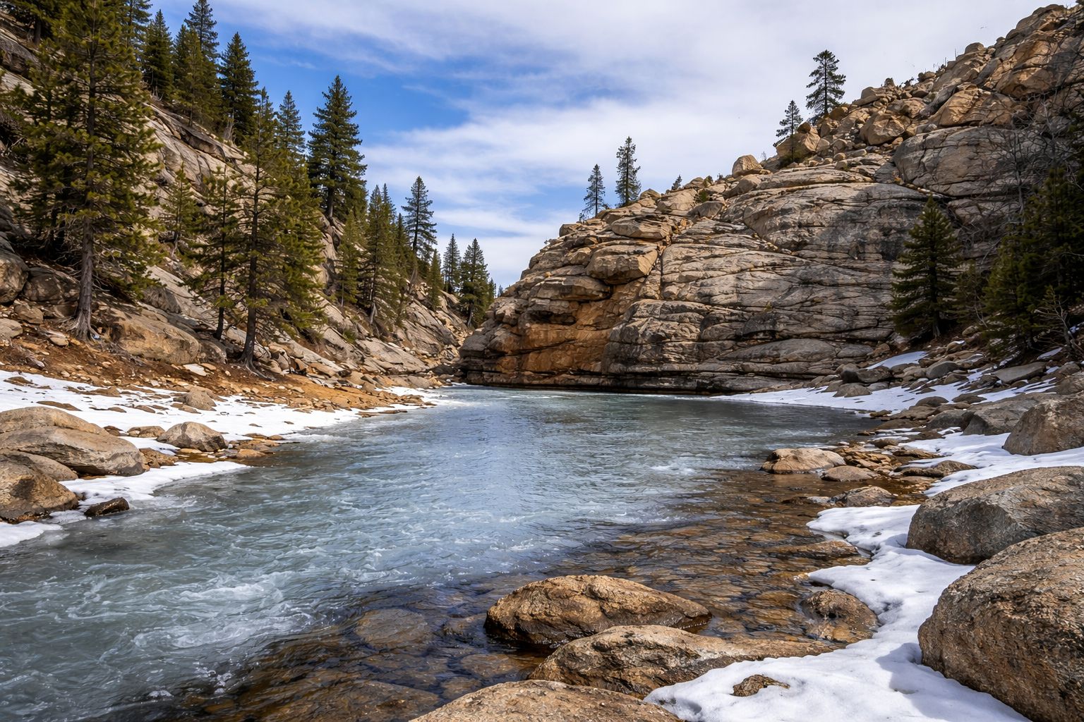 Higher elevations are still holding onto winter. Snow lingers along shaded slopes and deeper forest sections.